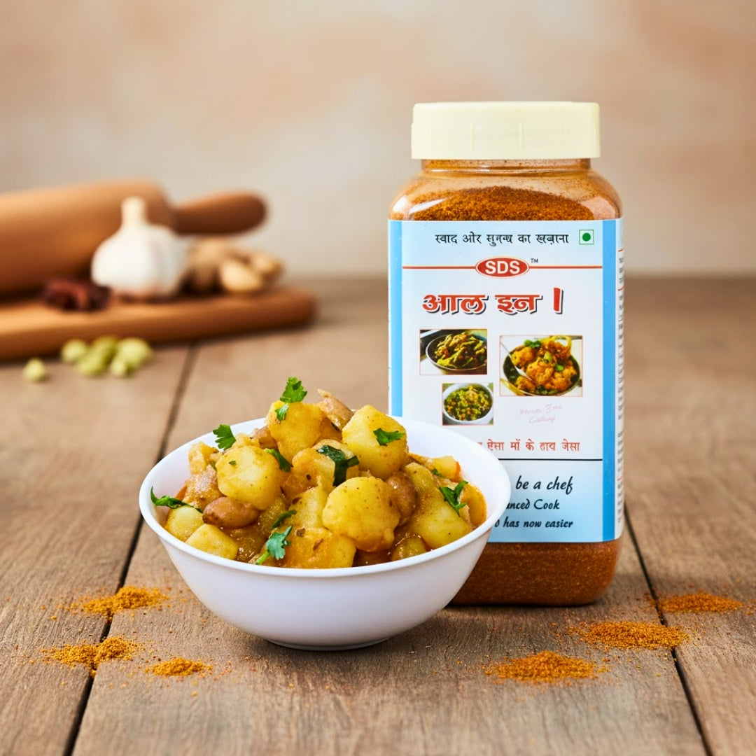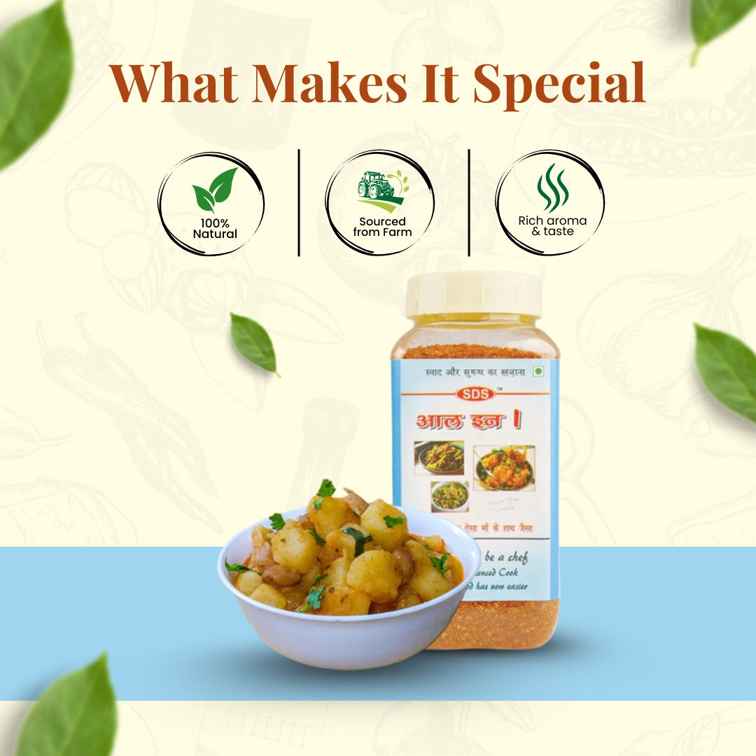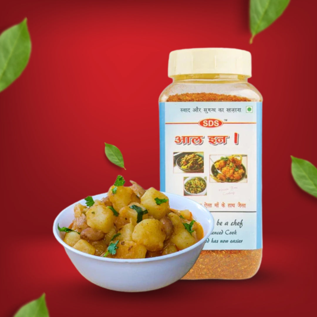 Experience the convenience and versatility of All in One Sabji Masala. This specially crafted blend of spices enhances the flavour and aroma of various vegetable dishes. Made from high-quality ingredients, this masala ensures an exceptional taste experience.