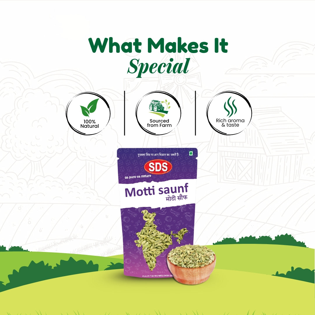 Experience the beautiful benefits of moti sauf (fennel seeds) more simply. Our saunf adds a delightful touch to your meals and serves as a natural digestive after your meals. Additionally, you can enjoy its refreshing properties as a mouth freshener. Discover its traditional use in Gujarati and Kashmiri cuisines, enhancing the authenticity of regional specialities.